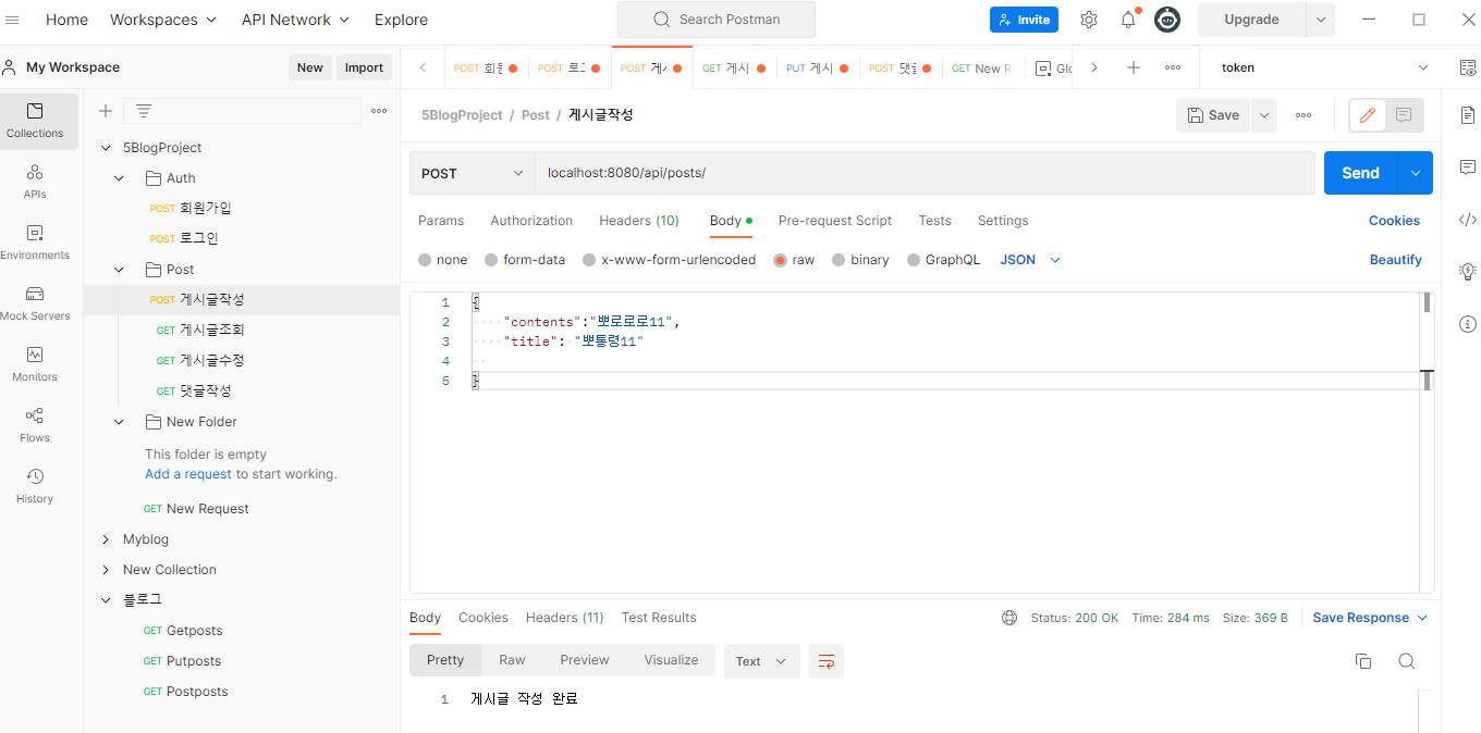 3 . 로그인API(토큰이 생성되는 API) -[Tests] 탭에