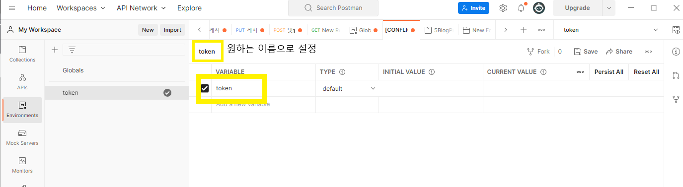 2 . 포스트맨 좌측 메뉴바에서 [Environment]클릭 - 원하는 이름으로 설정(예: token) -VARIABLE 에 "token"을 입력한다.