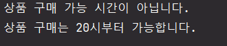 System.out.println("상품 구매는 20시부터 가능합니다.");