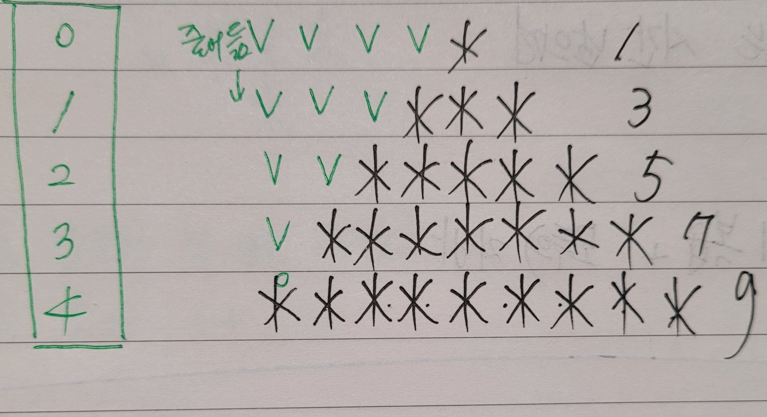 - 공백은 첫 줄에 네 칸이 생기므로, j가 4부터 시작하고 j(공백의 수)는 계속 줄어드는 형태다.