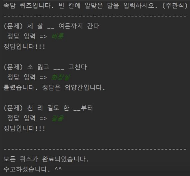 System.out.println("속담 퀴즈입니다. 빈 칸에 알맞은 말을 입력하시오. (주관식)");