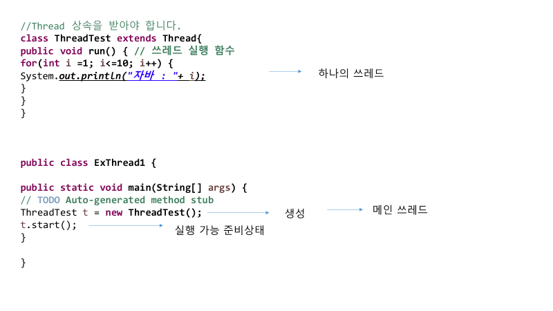 class ThreadTest extends Thread { // 일단 쓰레드를 만들려면 상속받아야 함.