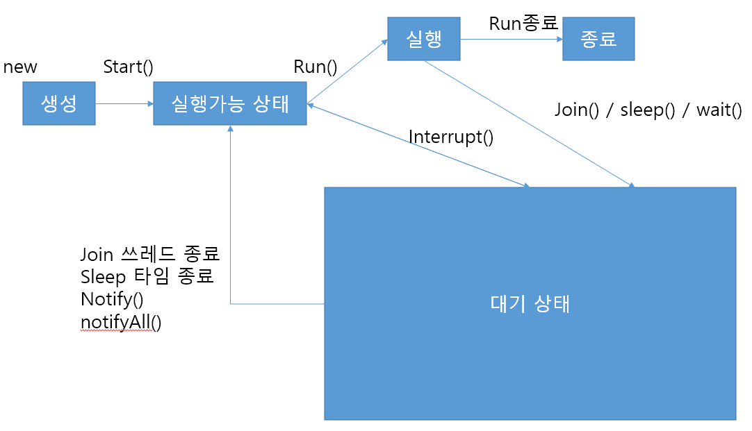 But. 실행 도중에 join, sleep, wait 등으로 변동을 줌. 대기 상태로 변환