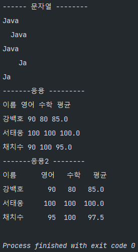 System.out.printf("%-6s %4d %4d %6.1f%n", "채치수", 95, 100, 97.5);