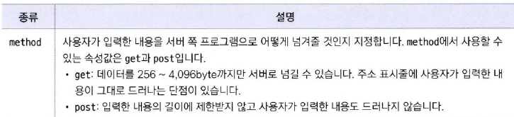 - 몇 가지 속성을 사용해서 입력받은 자료를 어떤 방식으로 서버로 넘길 것인지