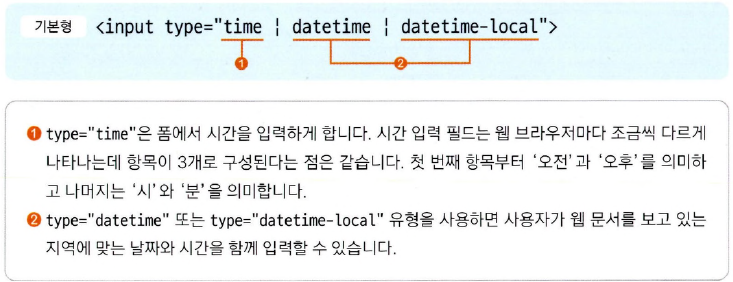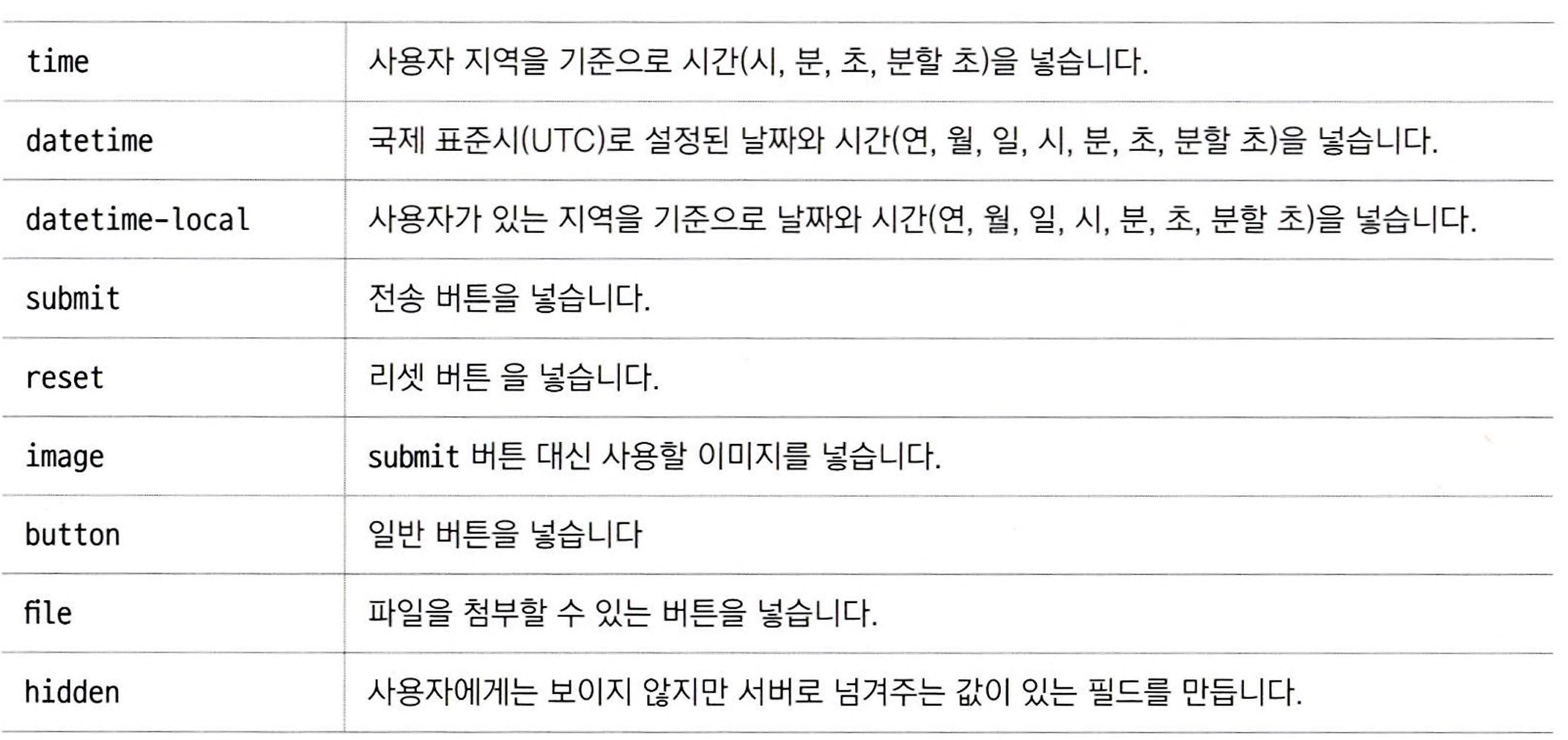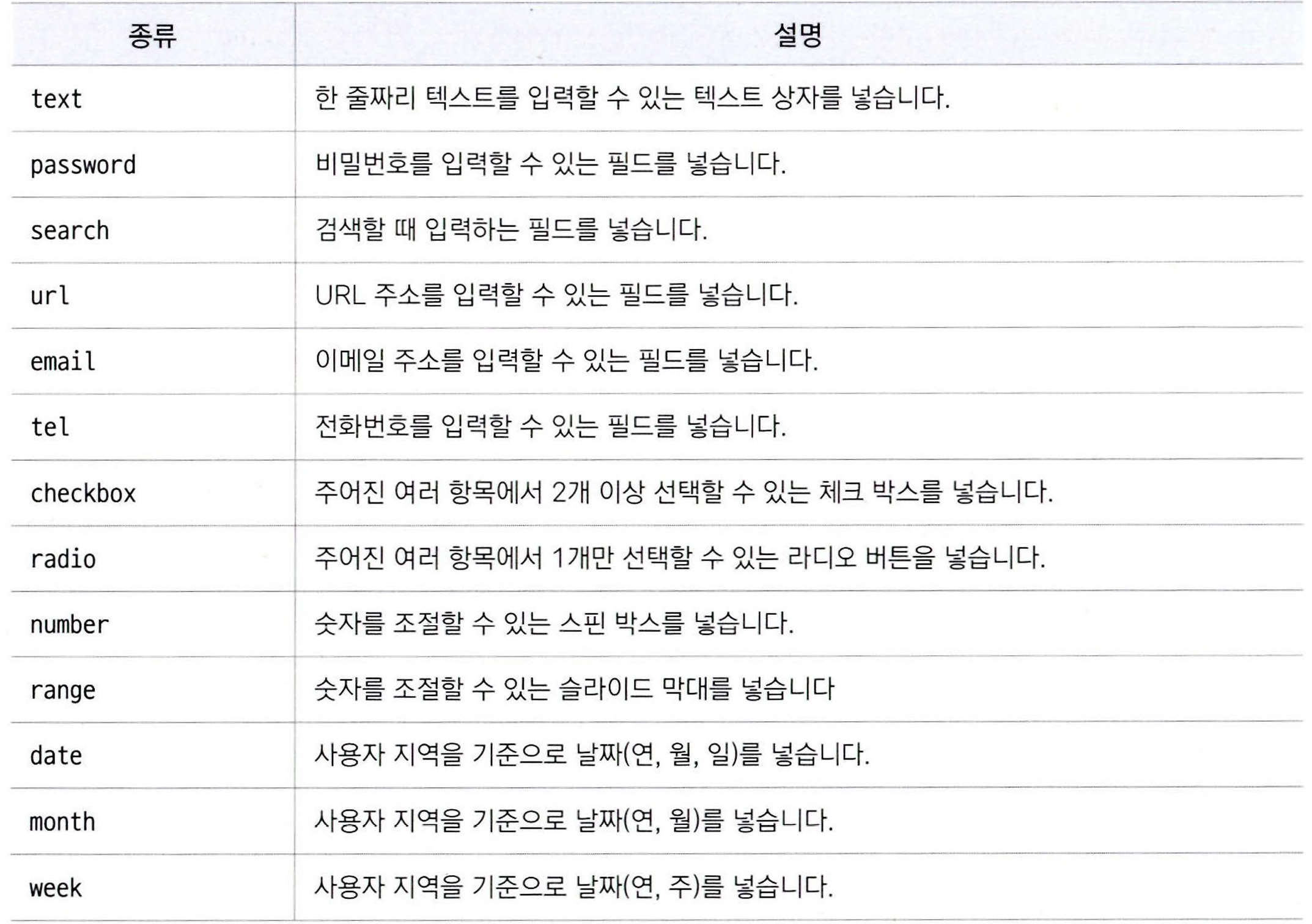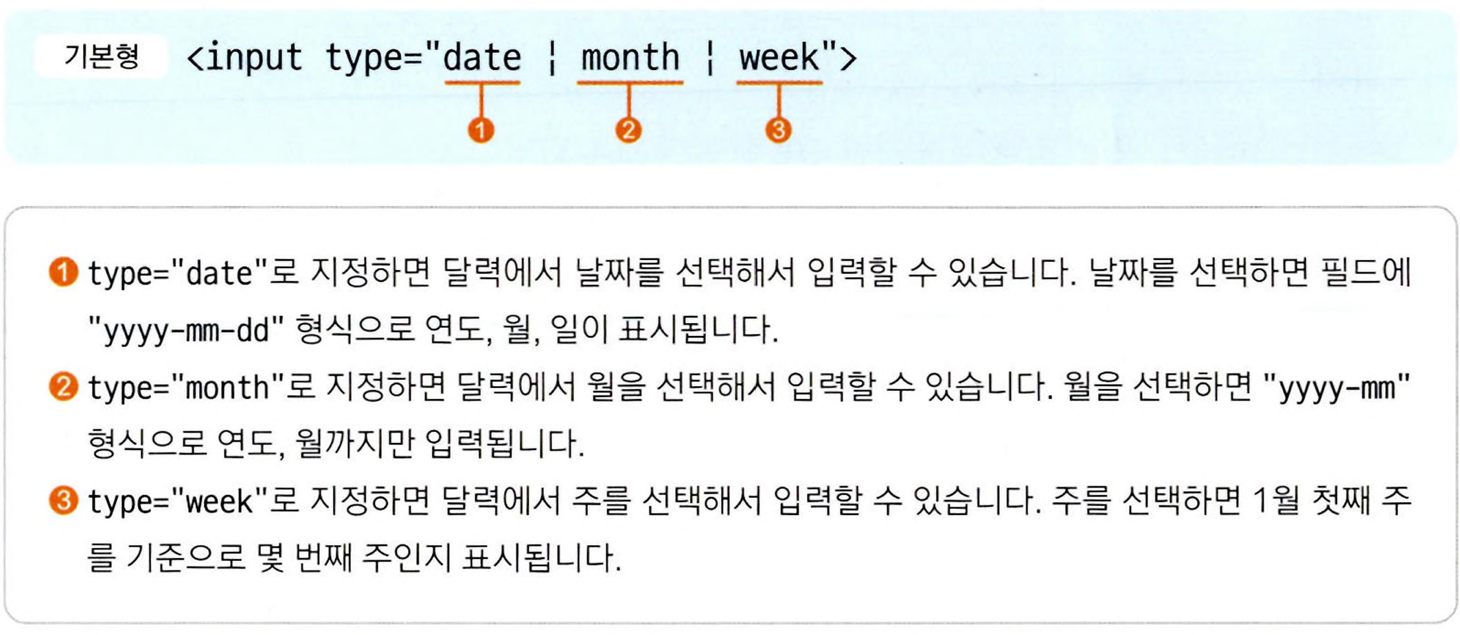 - type = "url"은 웹 주소를 입력할 필드. type ="email"은 이메일 주소를 입력. 입력값이 지정한 형식에 맞지 않으면 웹 브라우저가 알아서 오류 메시지를 표시한다.