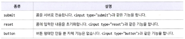 - 여기서는 앞의 <input> 과는 좀 다르게 버튼 태그를 이용하여 폼을 전송하거나 리셋하는 버튼을 삽입할 수 있다.