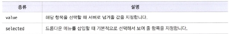 - <option> 태그에는 value 속성을 이용해 서버로 넘겨주는 값을 지정한다.