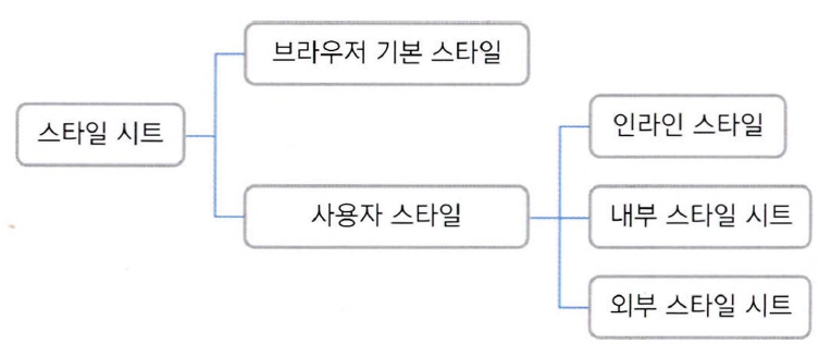 - 인라인 스타일 : 스타일 시트를 사용하지 않고 스타일을 적용할 대상에 직접 표시