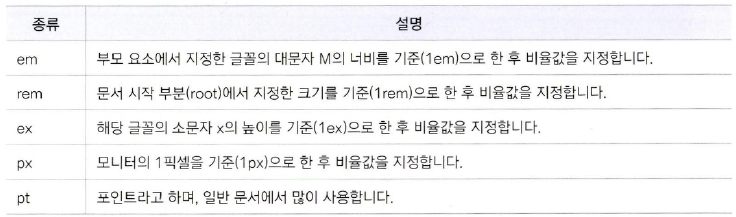- 정확한 단위로 크깃값을 지정하거나 문단의 글자 크기를 기준으로 몇 배수인지 백분율로 지정하곤 한다.