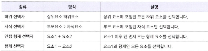 - 둘 이상의 선택자를 연결해서 스타일이 적용될 요소가 어느 부분인지 지정하는 역할을 수행