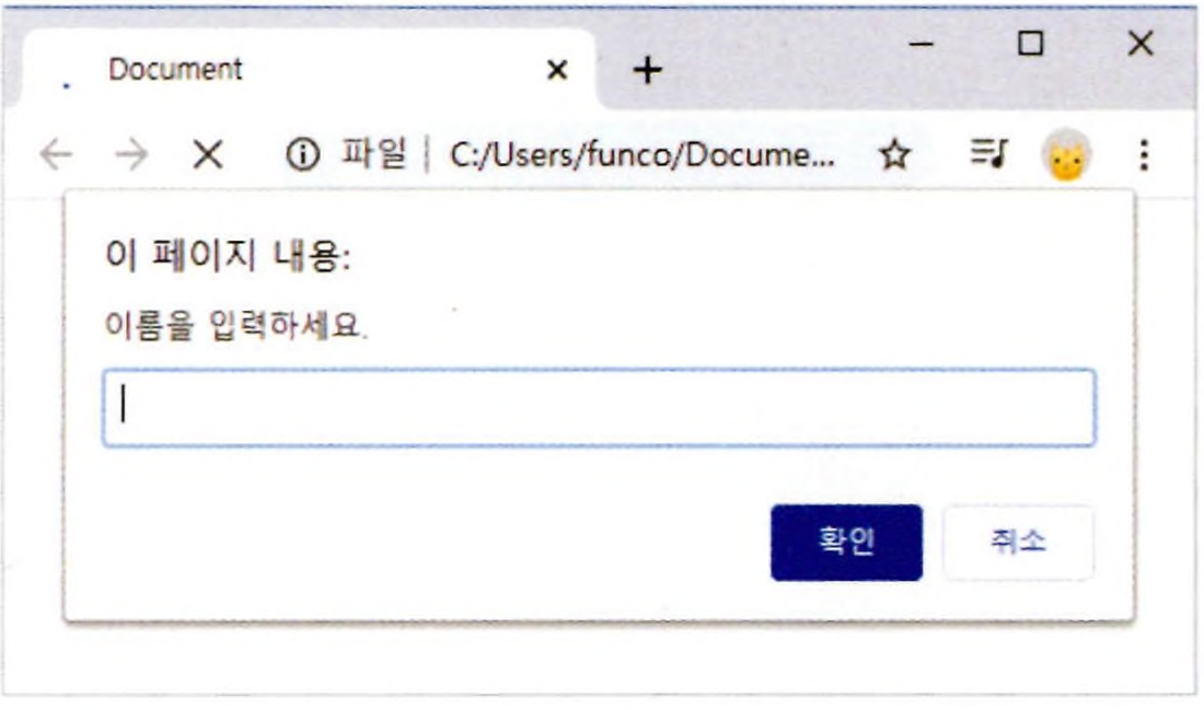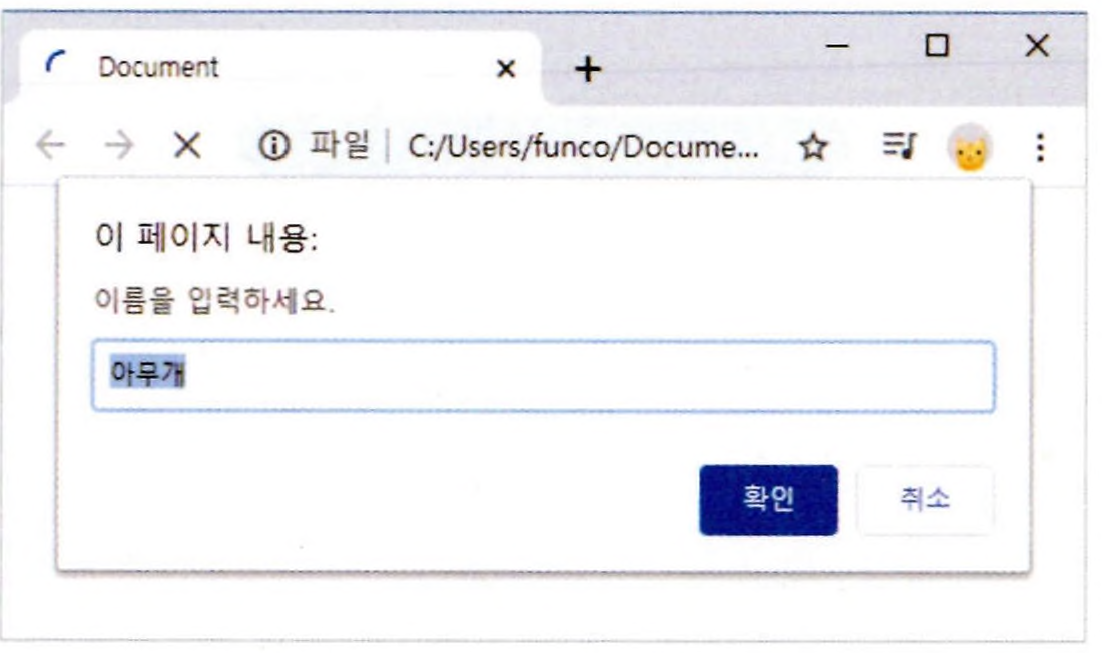 var name = prompt("이름을 입력하세요.", "아무개"); // 기본값 지정
