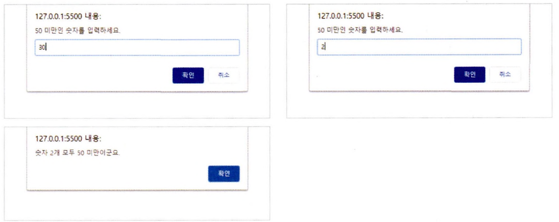 alert("두 개의 숫자 모두 50 미만이군요.");