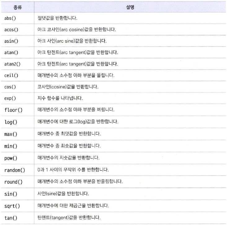 - Math 객체는 Date, Array와는 달리 따로 인스턴스를 만들지 않는다.