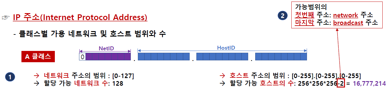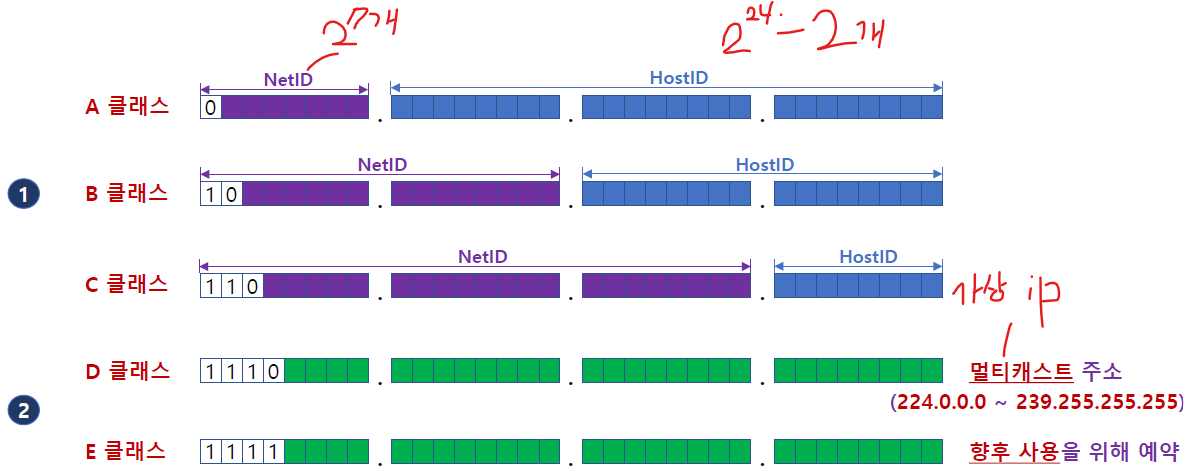 - A, B, C클래스는 네트워크의 개수와 호스트의 개수에 할당되는 바이트에 따라 분류가 된다.
