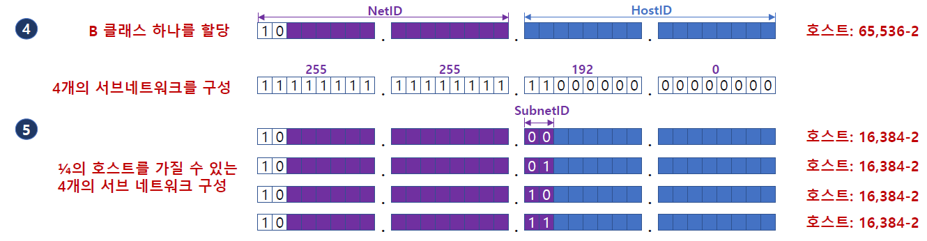 4개의 서브네트워크를 구성하고 1/4개의 호스트만큼을 가질 수 있도록 함.