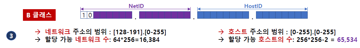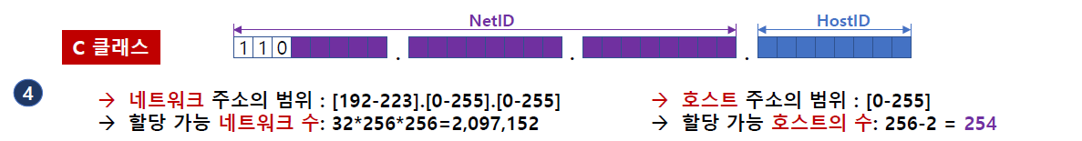 - B클래스와 C클래스의 구분은 네트워크 ID 에 몇 바이트를 할당하느냐에 따라 나뉨