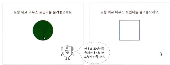 예제 - 사각형 위에 마우스 포인터 얹으면 초록색 원으로 바꾸고, 내려놓으면 원래 도형으로 되돌아감
