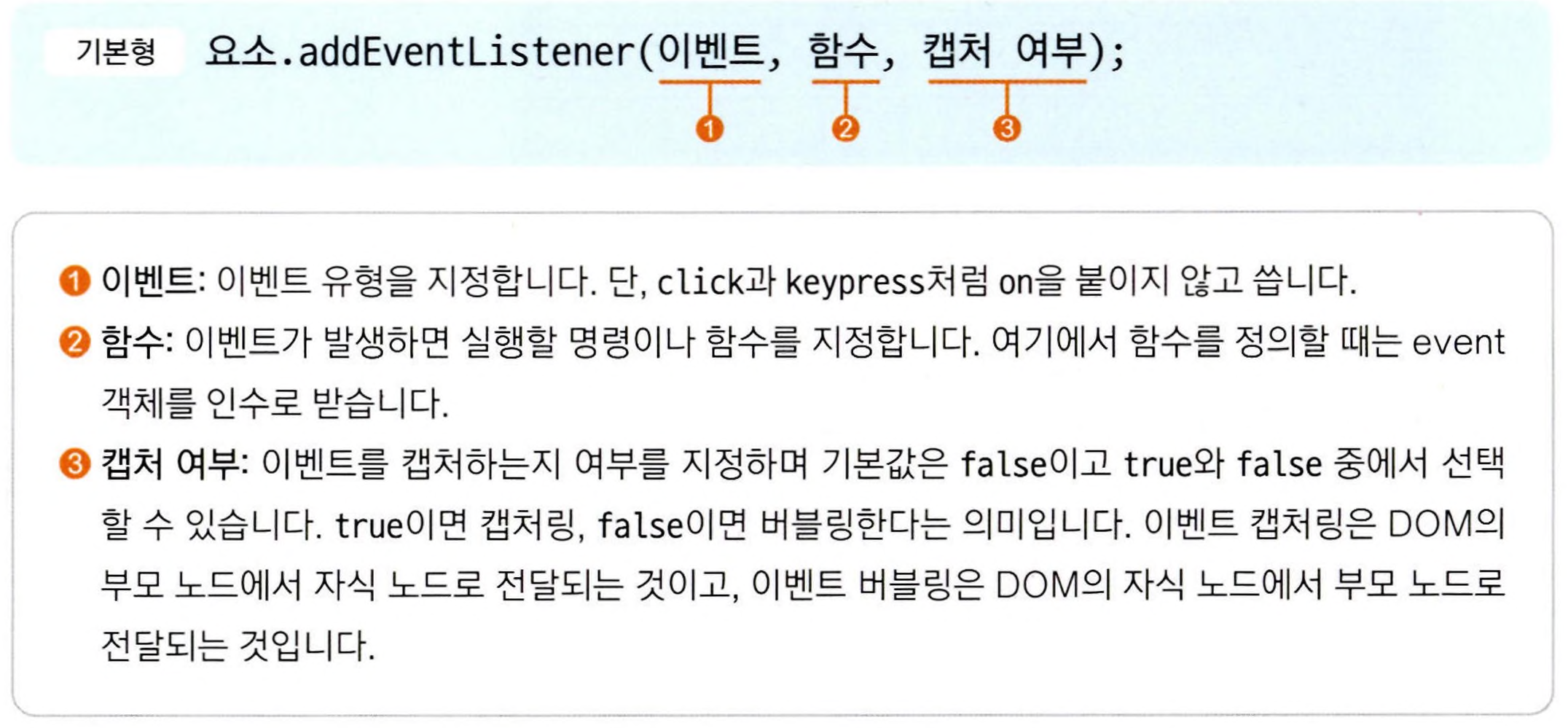 - addEventListener() 메서드는 끝에 세미콜론을 꼭 붙여야 한다.