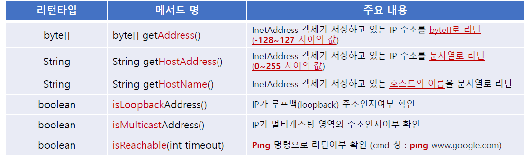 System.out.println(ia1.isReachable(1000)); // 1초 기다려서 ping 정보 도달하는지 확인 / true //Exception 처리 필요.