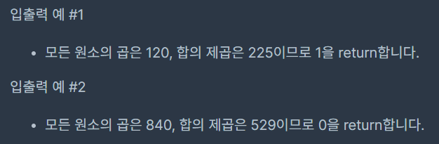 모든 원소들의 곱이 모든 원소들의 합의 제곱보다 작으면 1을 / 크면 0을 return하도록 solution 함수를 완성해주세요.