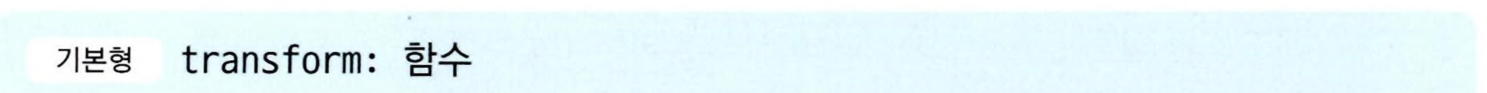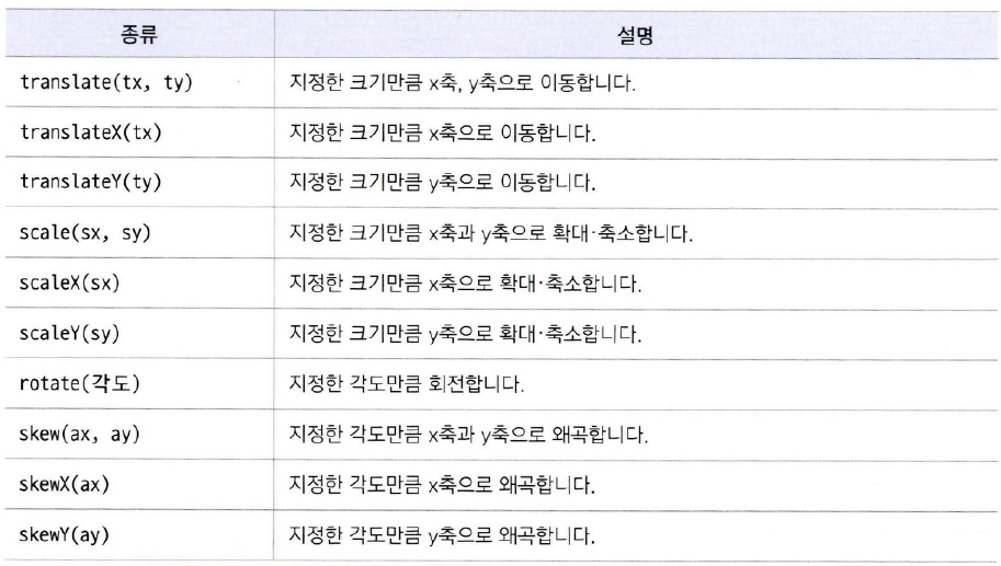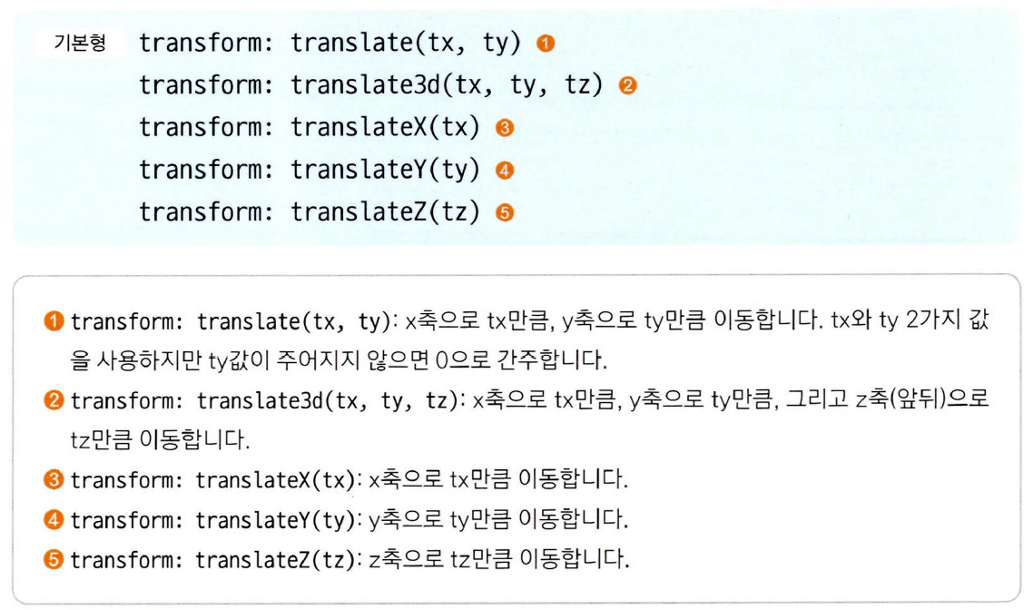 - translate( ) 함수는 x축이나 y축 또는 양쪽 방향으로 이동할 거리를 지정하면 해당 요소가 지정한 크기만큼 이동