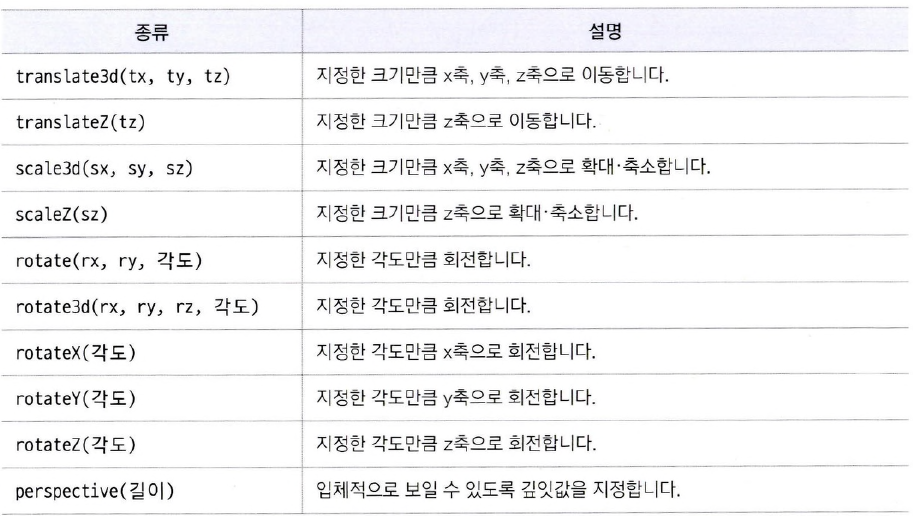 - 3차원 변형에서 z축은 앞뒤로 이동하며, 보는 사람 쪽으로 다가올수록 값이 커지고, 뒤로 갈수록 값이 작아진다.