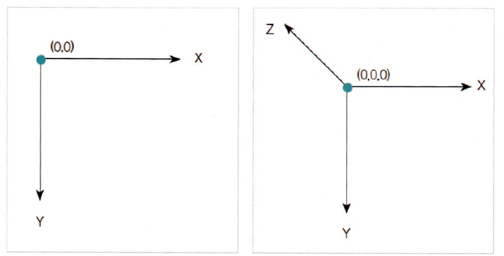 - x축은 오른쪽으로 갈수록 값이 커지고, y축은 아래로 내려갈수록 값이 커진다.