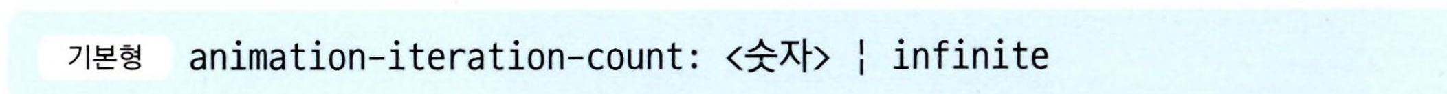 - 애니메이션을 반복해서 보여줘야 할 때는 animation-iteration-count 속성을 사용해 반복 횟수를 정한다.