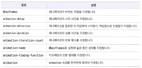 - 또한 웹 문서에서는 애니메이션을 여러 개 정의할 수 있으므로 이름을 이용해 애니메이션을 구별해야 한다.