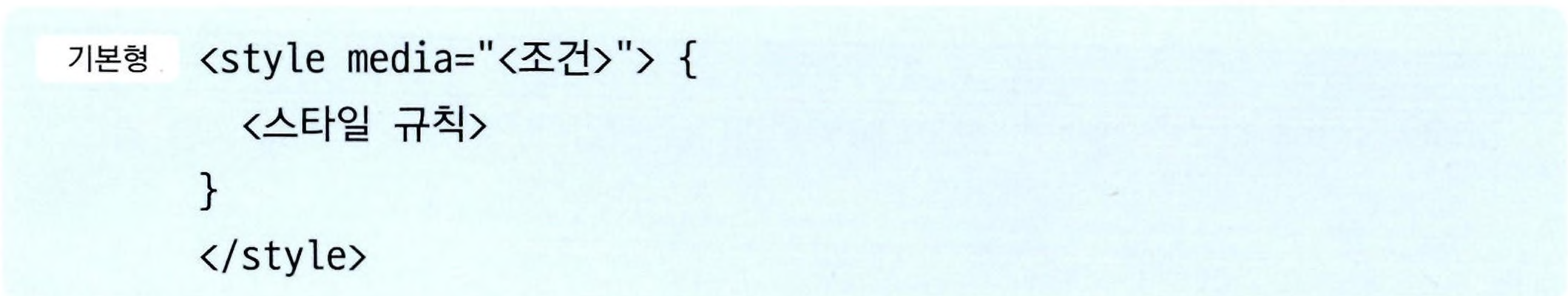 - 첫 번째 방법은 <style> 태그 안에서 media 속성을 사용하여 조건을 지정하고, 그 조건에 맞는 스타일 규칙을 정의하는 것.