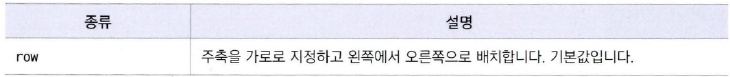 - 플렉스 컨테이너 안에서 플렉스 항목을 배치하는 주축과 방향을 지정하는 속성.
