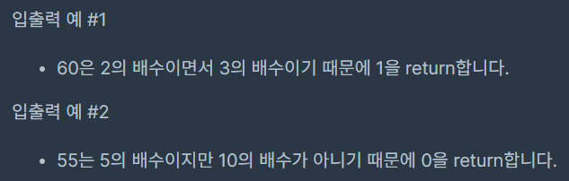 number가 n의 배수이면서 m의 배수이면 1을 / 아니라면 0을 return하도록 solution 함수를 완성해주세요.