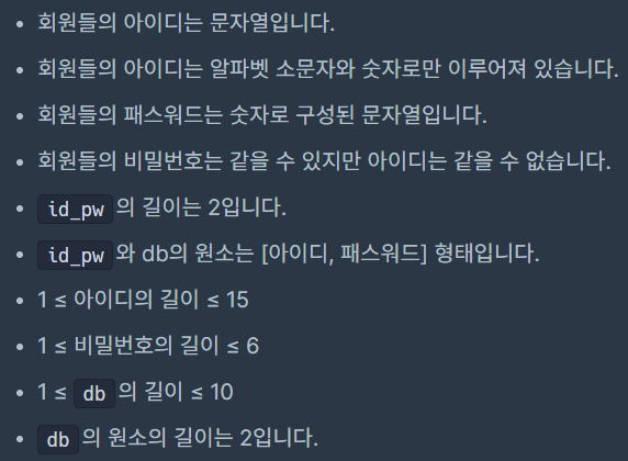 머쓱이가 입력한 아이디와 패스워드가 담긴 배열 id_pw와 회원들의 정보가 담긴 2차원 배열 db가 주어질 때,