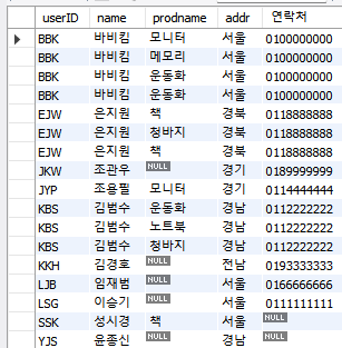 SELECT u.userID, u.name, b.prodname, u.addr, CONCAT(u.mobile1, u.mobile2) AS '연락처'