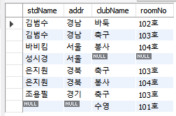 - 클럽을 기준으로 조인해야 하므로 두 번째 조인은 RIGHT JOIN으로 처리해서 clubtbl이 기준이 되도록 설정하면 된다.