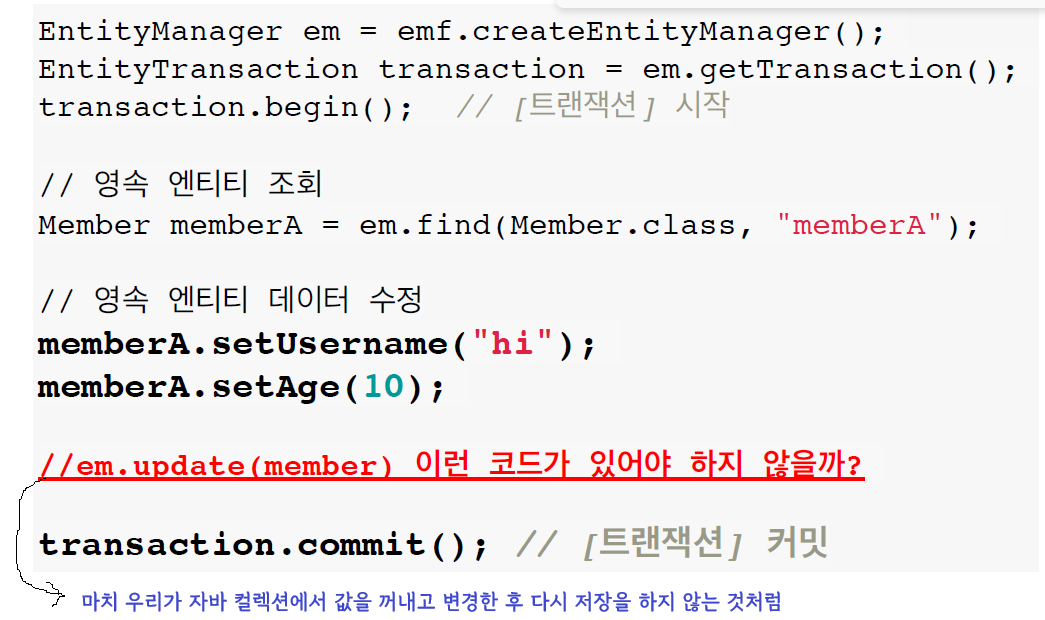 - JPA는 값을 변경하면 트랜잭션이 커밋 되는 시점에 무조건 변경을 반영한다고 생각하면 편함