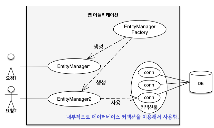 J2EE 환경, 스프링 프레임워크 같은 컨테이너 환경 : 엔티티 매니저와 영속성 컨텍스트가 N : 1