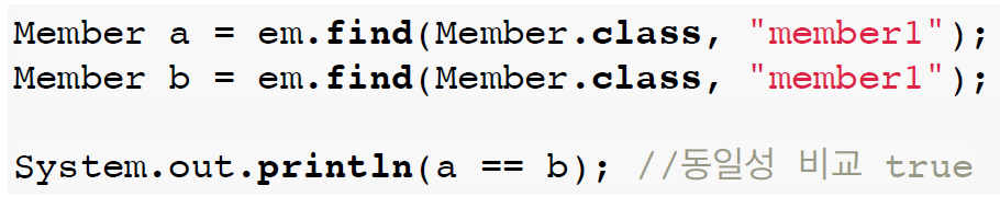 => 내가 자바 컬렉션에서 가져왔을 때 주소가 동일했던 것처럼, JPA가 == 비교를 보장해준다는 뜻. (1차 캐시 덕분)