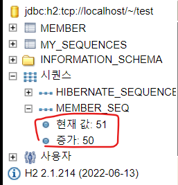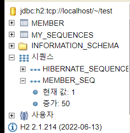 Hibernate: create sequence MEMBER_SEQ start with 1 increment by 50