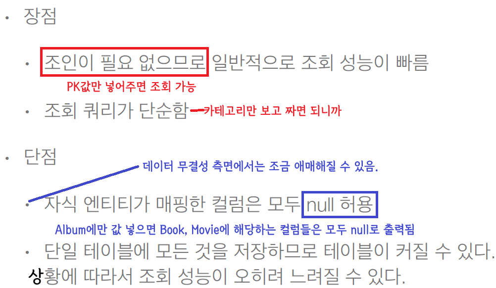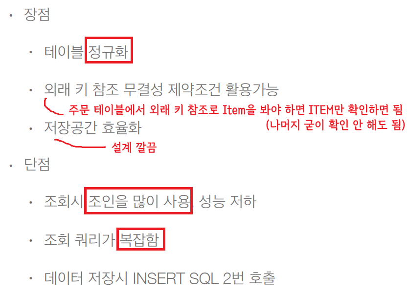 - 인서트 한 번만 들어가고, 조인 필요 없고, select도 깔끔함.