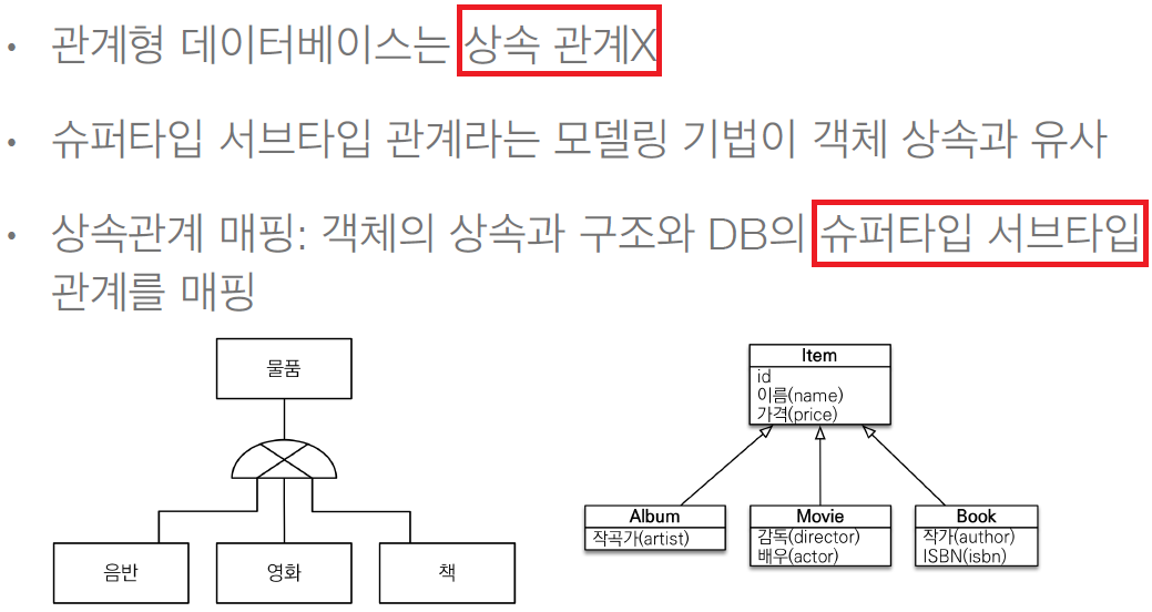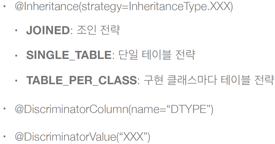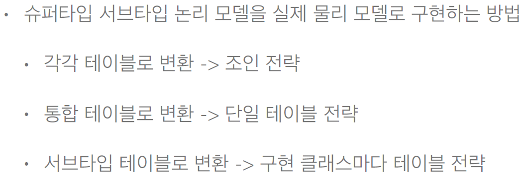 정리하자면, DB의 슈퍼타입-서브타입 모델링 기법을 3가지 방법 중 어떤 걸 선택하여 구현해도 다 매핑할 수 있도록 JPA가 지원해줌.
