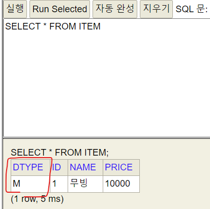얘는 한 테이블에 다 때려박기 때문에 JPA가 구분을 위해 DTYPE을 넣어준다 필수 로.