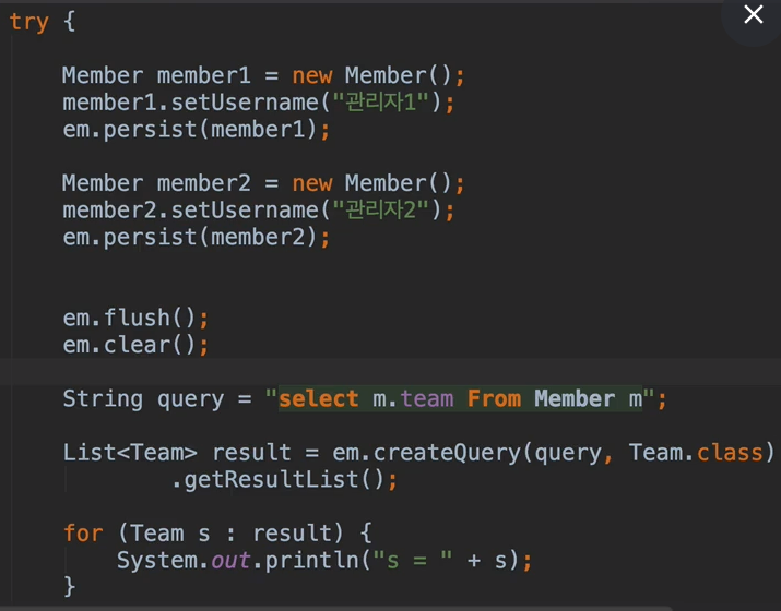 String query = "select m.team.~~ From Member m";