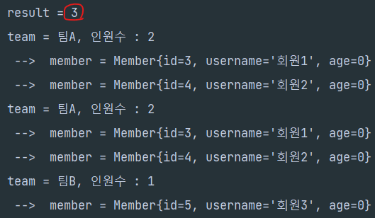 System.out.println("team = " + team.getName() + ", 인원수 : "+ team.getMembers().size());