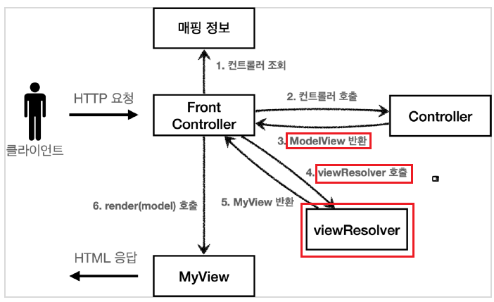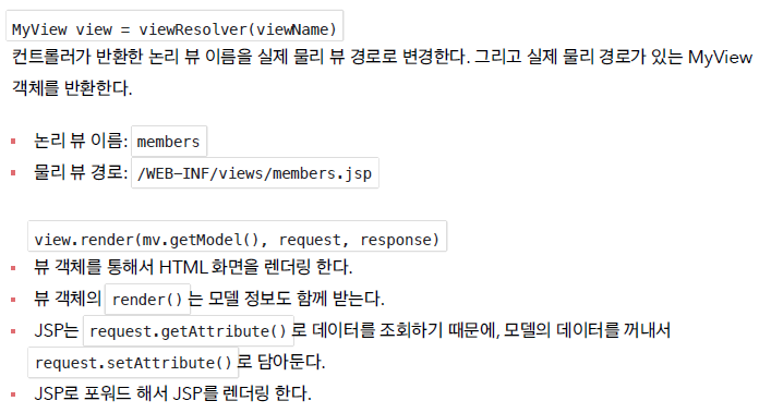 MyView view = viewResolver(viewName); // 뷰 리졸버가 객체까지 만들어주는 것. 설계상 메서드 분리