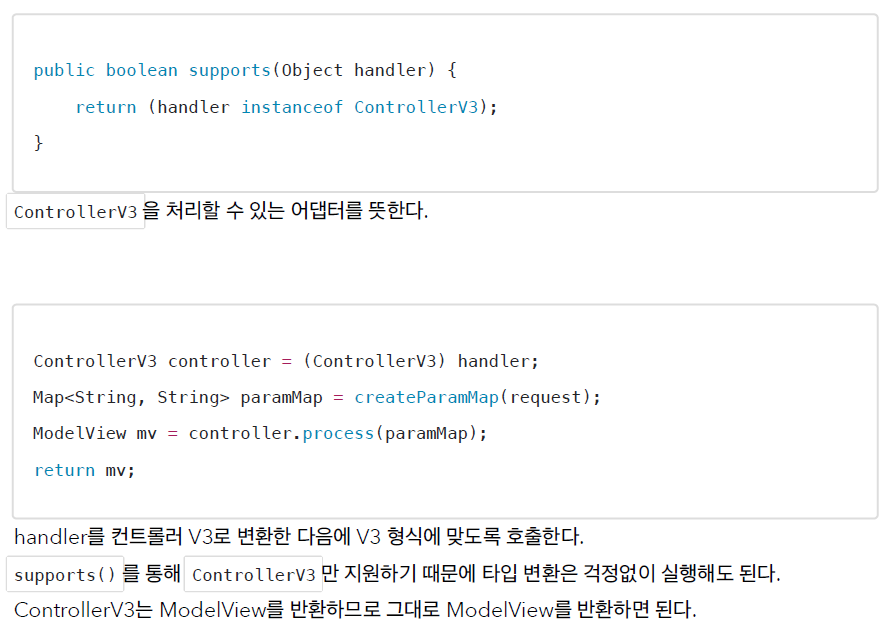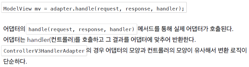 - 이 컨트롤러 어댑터는 ControllerV3 타입의 컨트롤러를 처리하기 위한 어댑터로, 해당 컨트롤러를 실행하고 모델 뷰를 반환하는 역할
