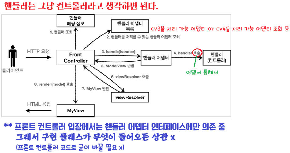 지금까지 우리가 개발한 프론트 컨트롤러는 한가지 방식의 컨트롤러 인터페이스만 사용할 수 있다.