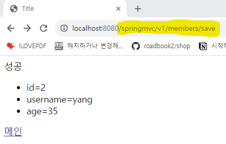 - @RequestMapping("/springmvc/v1/members/save") 어노테이션은 해당 메서드를 지정된 URL 패턴에 매핑.
