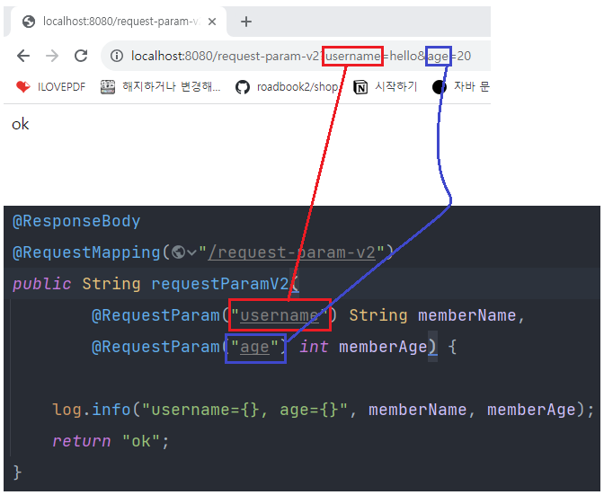 // @RequestParam 어노테이션을 사용하되, 파라미터 이름과 메서드 매개변수 이름이 동일한 경우.